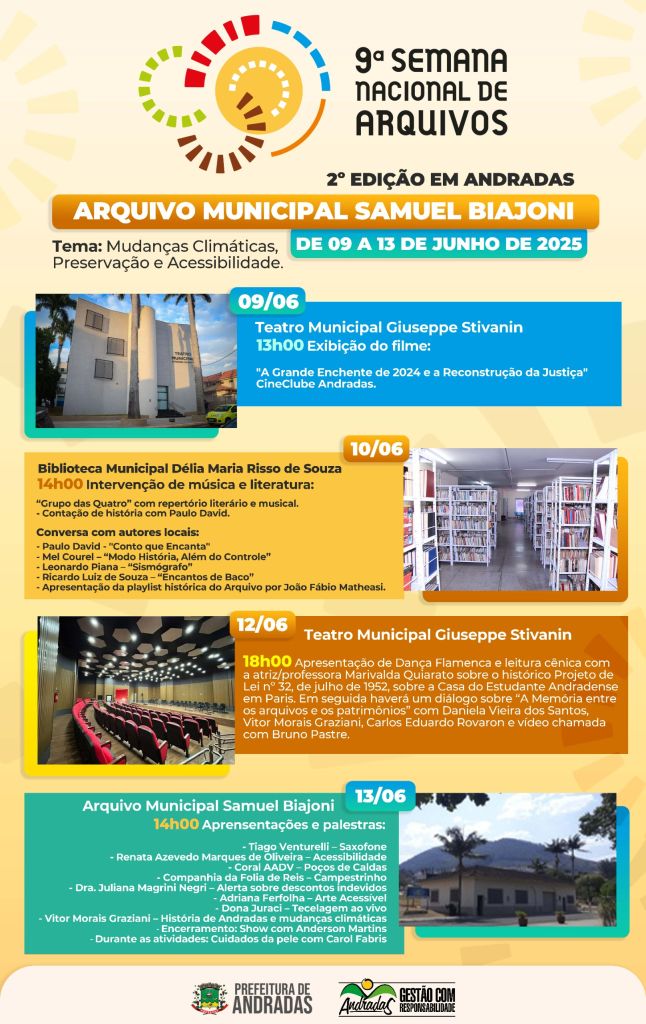 A Prefeitura Municipal de Andradas, por meio do Arquivo Municipal Samuel Biajoni, convida toda a comunidade para a 2ª Edição da Semana Nacional de Arquivos de Andradas, que acontecerá de 09 a 13 de junho de 2025, com o tema proposto pelo Arquivo Nacional: “Mudanças Climáticas, Preservação e Acessibilidade”.