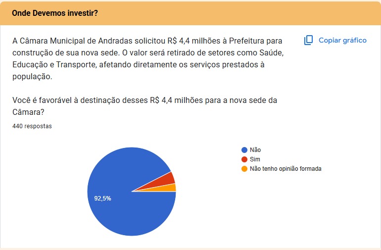 Um dos temas que gerou mobilização foi a proposta da Câmara Municipal de Andradas para ampliar de R$ 3,2 milhões para R$ 7,6 milhões o valor do duodécimo — recurso anual transferido pela Prefeitura ao Legislativo. A justificativa apresentada pela Câmara em ofício enviado ao Poder Executivo, seria a construção de uma sede própria. A proposta foi rejeitada por 92,5% dos participantes da consulta, que demonstraram preocupação com a retirada de recursos de áreas essenciais como saúde, educação e transporte.