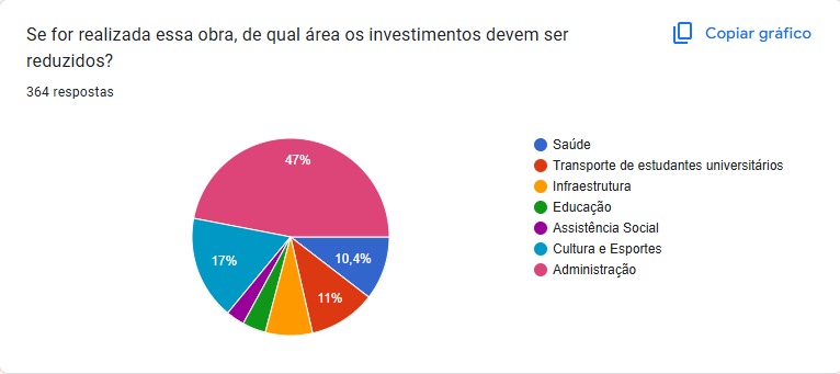 Quando questionados sobre quais áreas deveriam ter os investimentos reduzidos caso a Câmara mantenha o pedido de aumento do repasse para os próximos 4 anos a partir de 2026, 47% apontaram a Administração como o setor a ser impactado, seguidos por Cultura e Esportes (17%) e Saúde (10,4%).