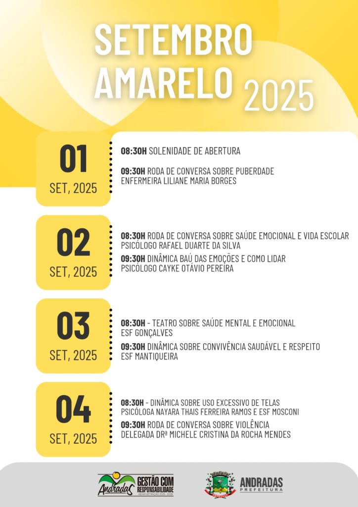 A Prefeitura de Andradas, por meio da Secretaria de Saúde e Ação Social, promove de 1º a 4 de setembro ações da campanha Setembro Amarelo, voltada à conscientização e prevenção do suicídio. As atividades, voltadas para a saúde mental, incluem atividades direcionadas especialmente a estudantes, de conscientização e orientação, em parceria com a Secretaria de Educação, e acontecem no Teatro Municipal, com palestras, rodas de conversa, dinâmicas e apresentação teatral.