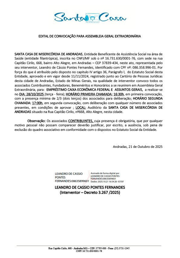 A SANTA CASA DE MISERICÓRDIA DE ANDRADAS, Entidade Beneficente de Assistência Social na área de Saúde (entidade filantrópica), representada pelo seu interventor, Leandro de Cássio Pontes Fernandes, convoca todos os associados Contribuintes, Fundadores, Beneméritos e Honorários a se reunirem em Assembleia Geral Extraordinária, para: EMPRÉSTIMO CAIXA ECONÔMICA FEDERAL E ASSUNTOS GERAIS, conforme edital de convocação abaixo: